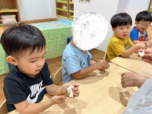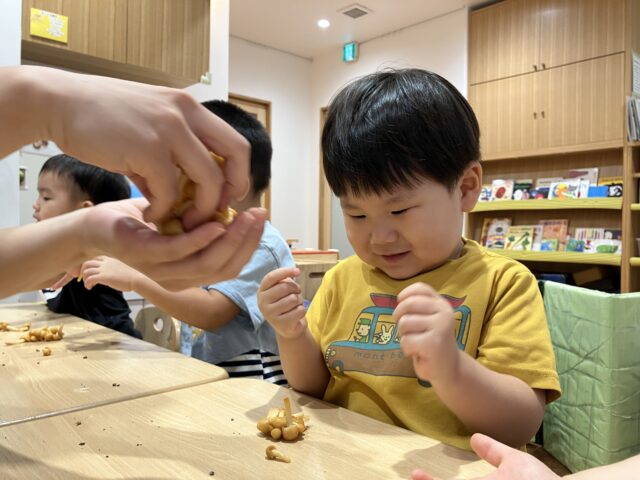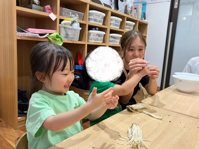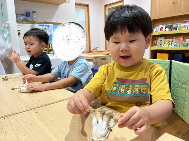 2025.09.12 保育園の日常、水天宮前園 きのこさきをしたよ🍄 うさぎ組さんが食育できのこさきをしました🍄 どんなきのこがあるのかな?名前を聞いて1種類ずつ順番にさいていきます。 しいたけはちょっと硬い! しめじはやりやすい! えのきは手にくっつく! なめこはなんだかヌルヌルする…😅 さまざまな種類のきのこに、みんなで楽しく親しむことができました😆✨