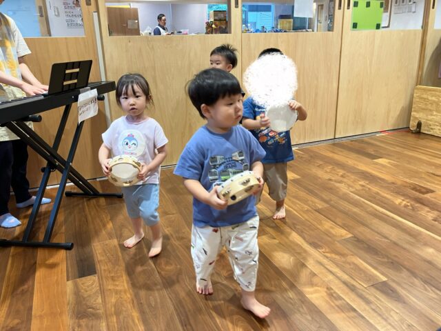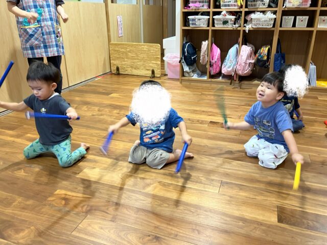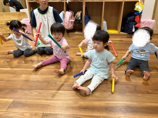 2歳児クラスでも音の高低を聴き分けながら正しいビートで叩いていました♪