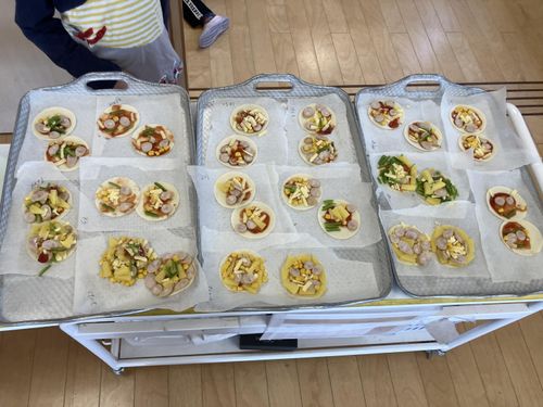 2026.02.24 保育園の日常、西馬込駅前保育園 卒園までにしたいこと 年長児さんは卒園までにしたい事を1人ひとつ出し合い 1つひとつ叶えています。 今回は「みんなでピザをつくりたい!」 山盛りよくばりピザだよ!火通るかな…? 顔つくったんだー! 好きなものを好きなだけ乗せたそれぞれのピザの完成です!✨ 出来上がりが楽しみですね! いただきま~す♪
