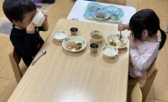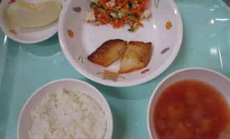 東葛西園の給食 かれいの味噌照り焼き・にんじんと豆腐のサラダ